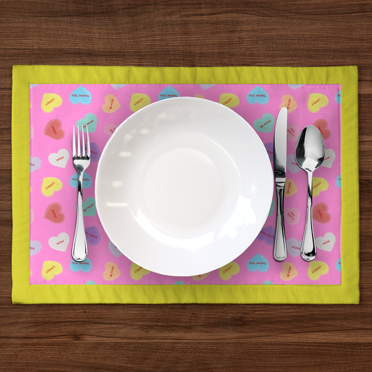 Love Pink Candy Hearts with Laughter Yellow PlacematVendor:ONE LimitedRegular price $12.00Regular priceUnit price / per$12.00Sale price $12.00