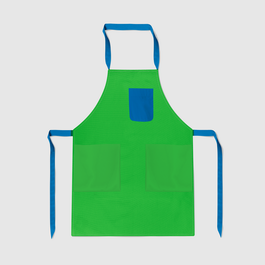 Solid Full Chef Apron in Green with Deep Blue Pocket in Mid Weight Cotton Twill