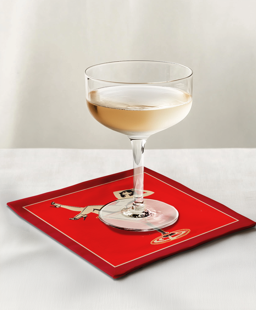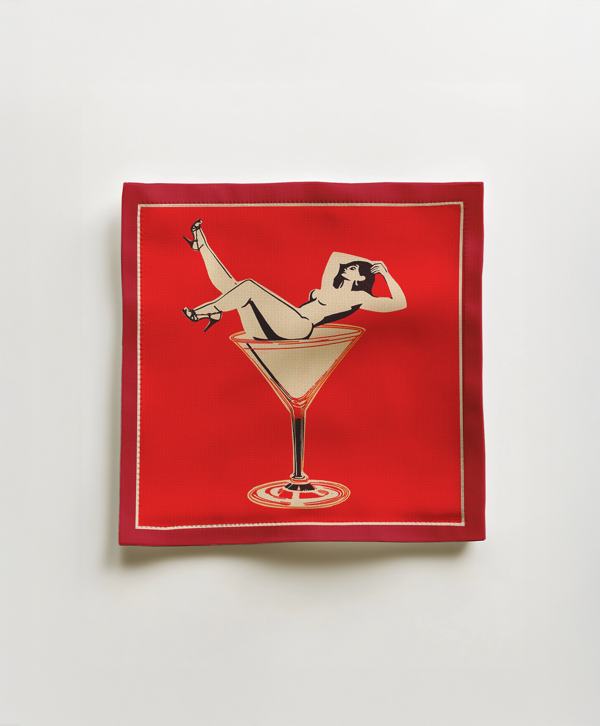 Vintage Pin-Up Cocktail Napkin - Add a playful touch of mid-century charm to your home bar with our vintage-inspired cocktail napkin. This cheeky illustration features a tastefully drawn pin-up beauty posed within a classic martini glass, capturing the glamorous spirit of 1960s cocktail culture.