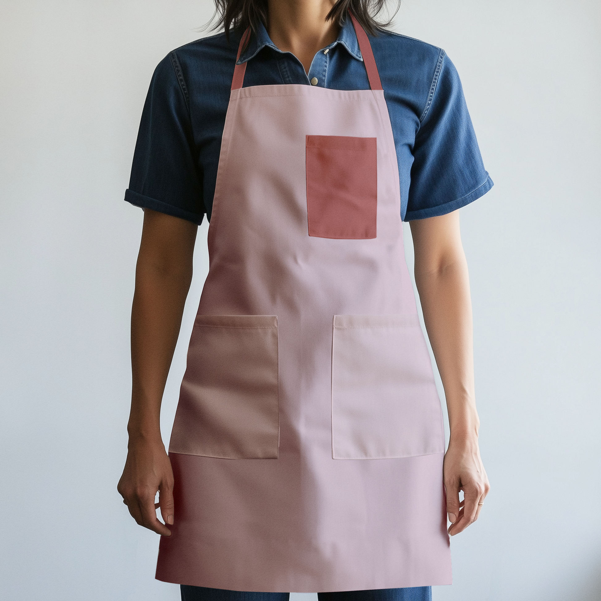 Solid Full Chef Apron in Blush with Red Pocket in Mid Weight Cotton Twill