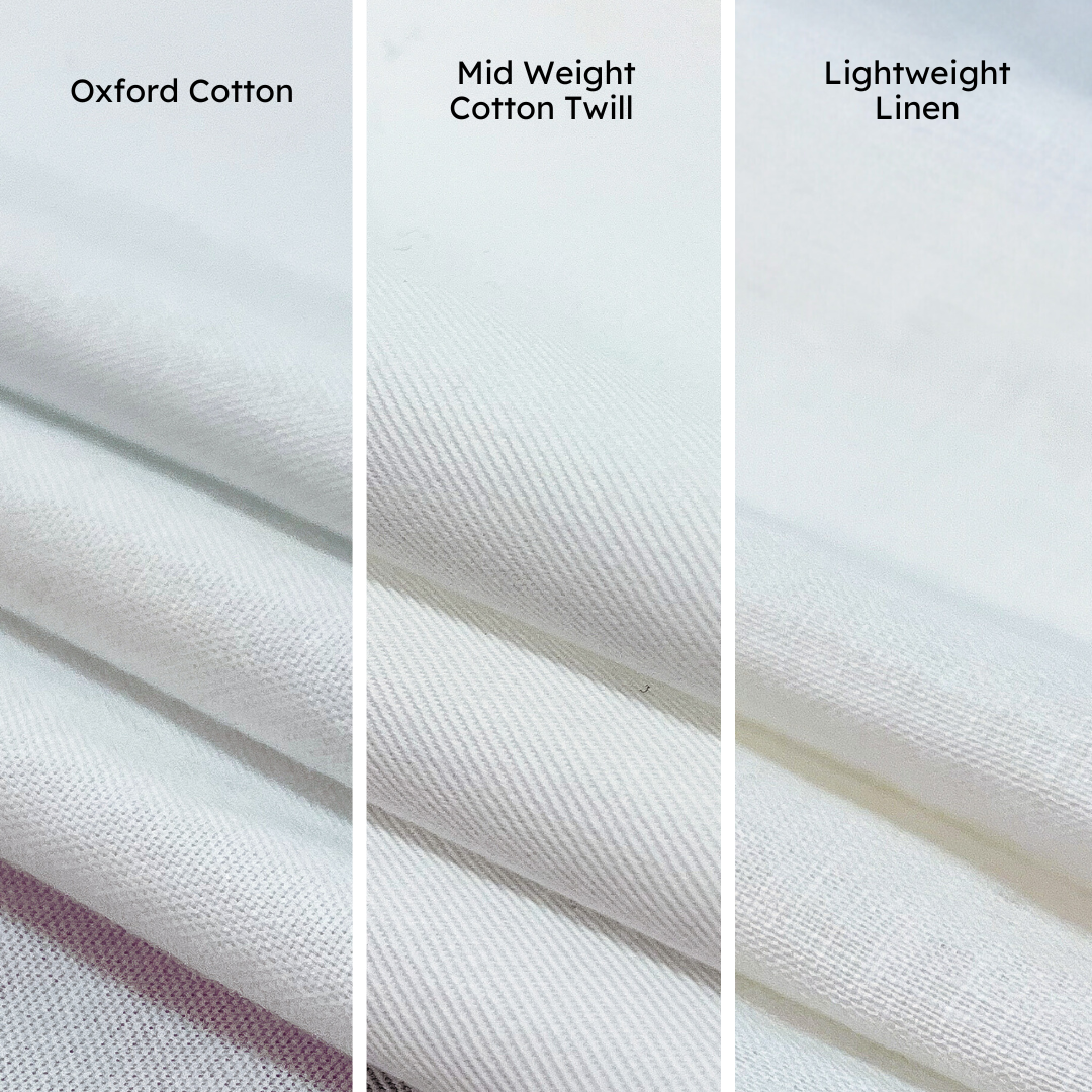 - Oxford Cotton: Durable and versatile fabric characterized by its basket-weave structure and soft, slightly textured finish, and known for its resilience and breathability. Machine wash with cold water, tumble dry low.