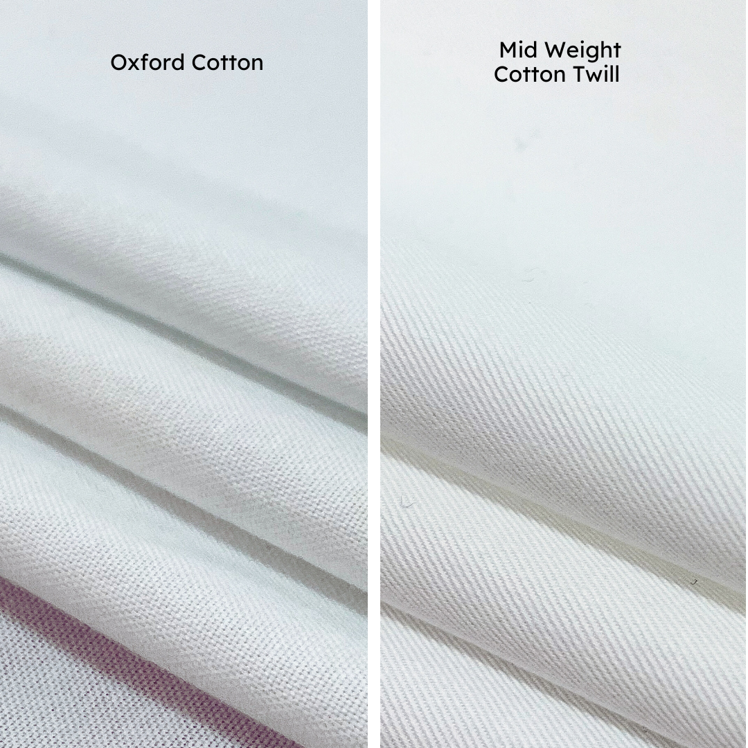 - Mid Weight Cotton Twill: Known for its durability, structured texture, and medium weight, this classic twill weave offers a diagonal rib pattern and a sturdy hand feel. It has a sturdy drape that holds its shape well. Machine wash with cold water, tumble dry low.