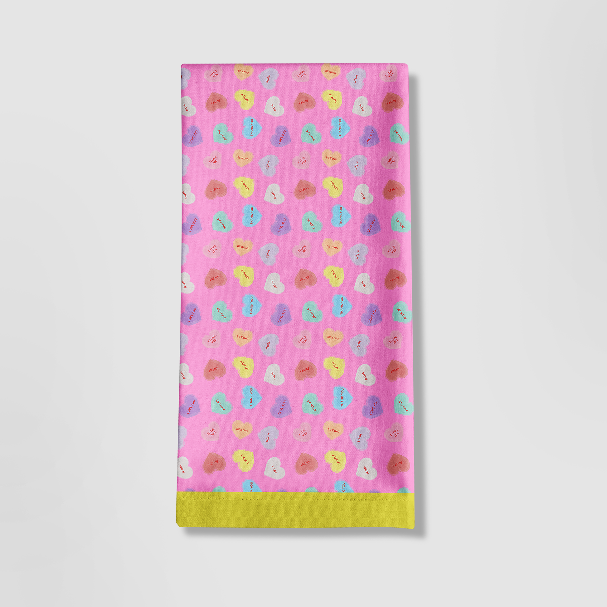 Love Pink Candy Hearts with Laughter Yellow Tea Towel