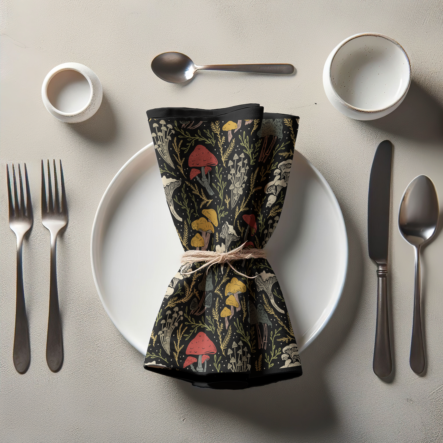 Flavorful Fungi Edible Mushrooms Black Napkin in Organic Cotton Voile